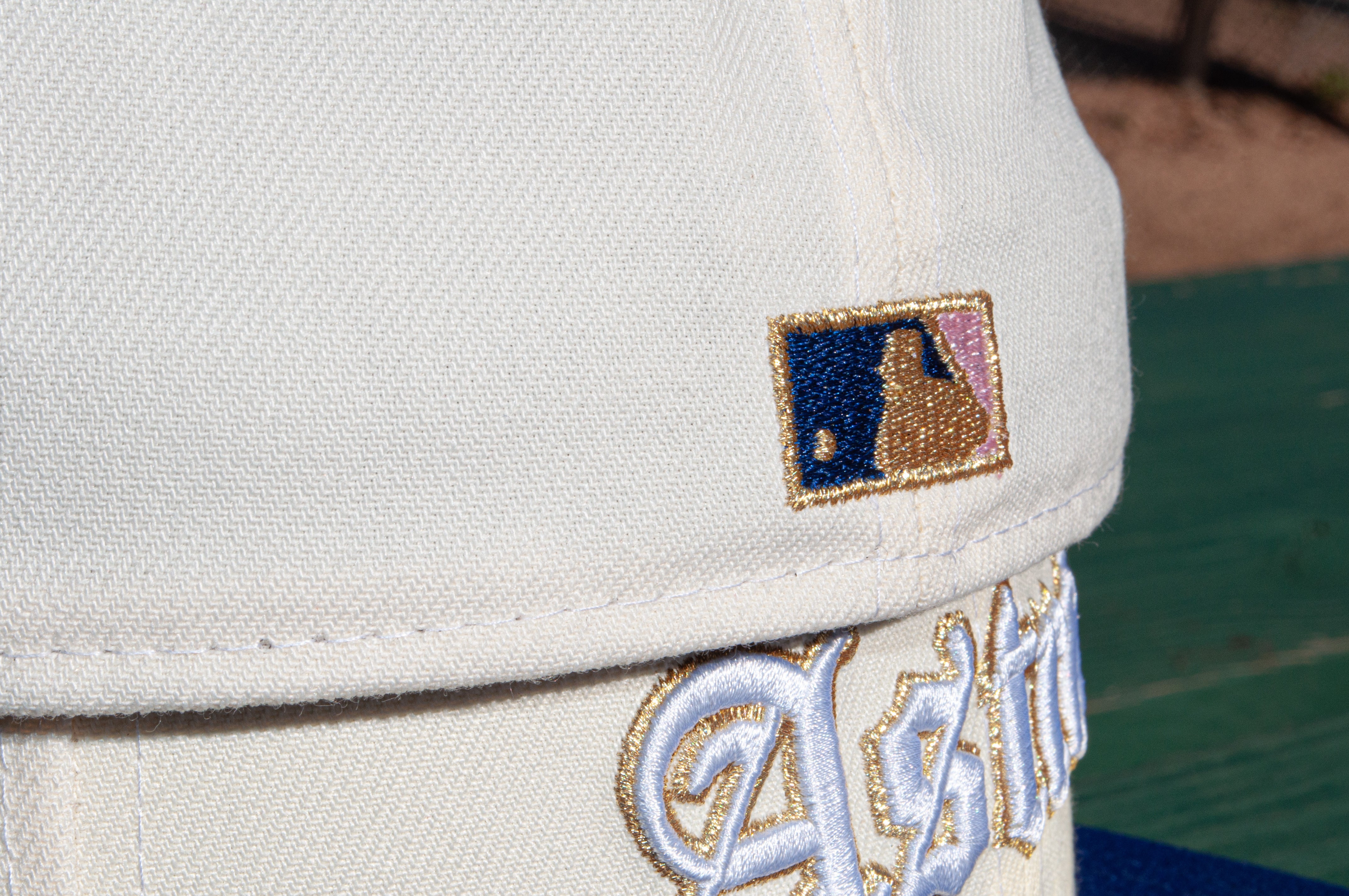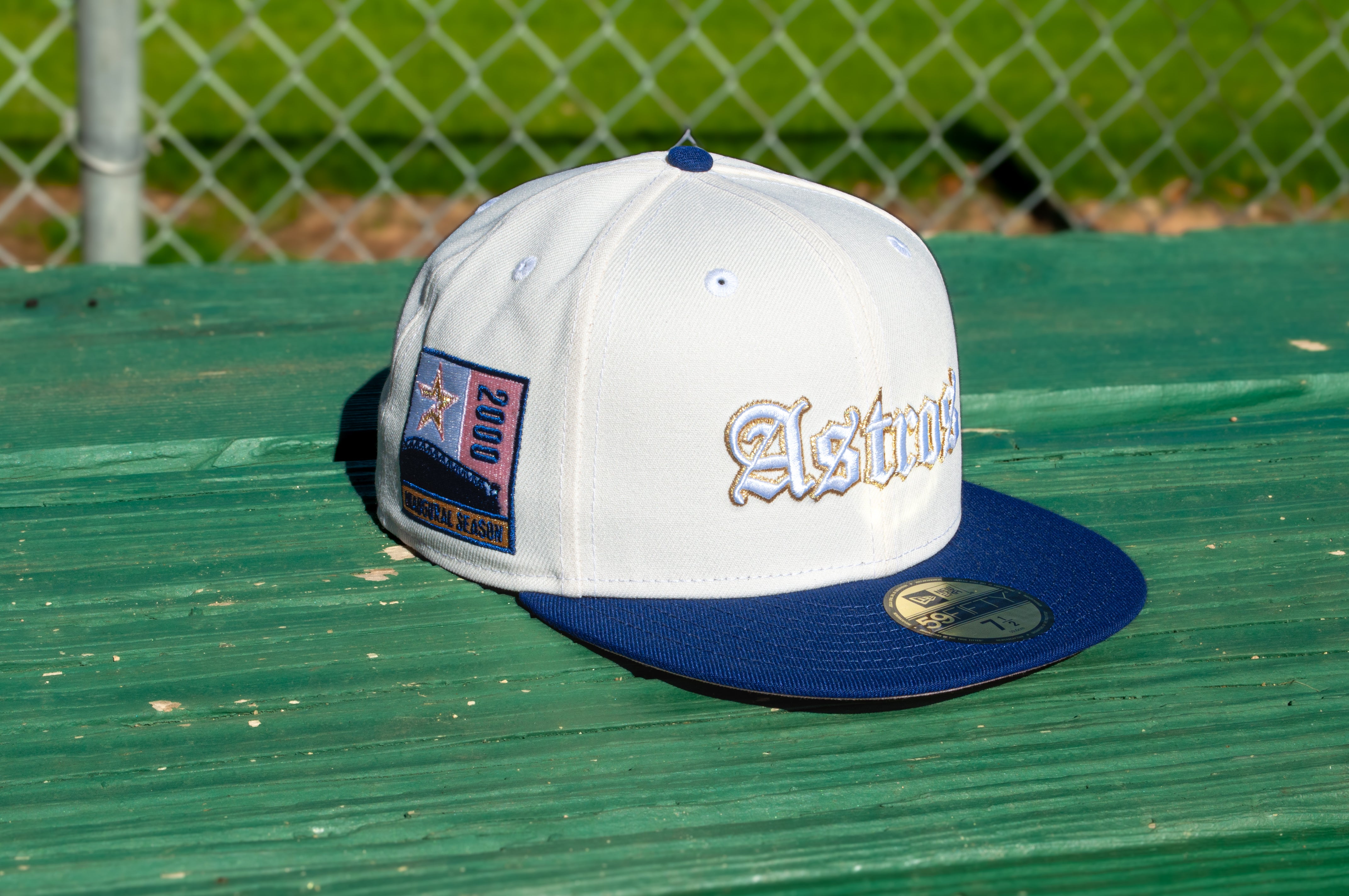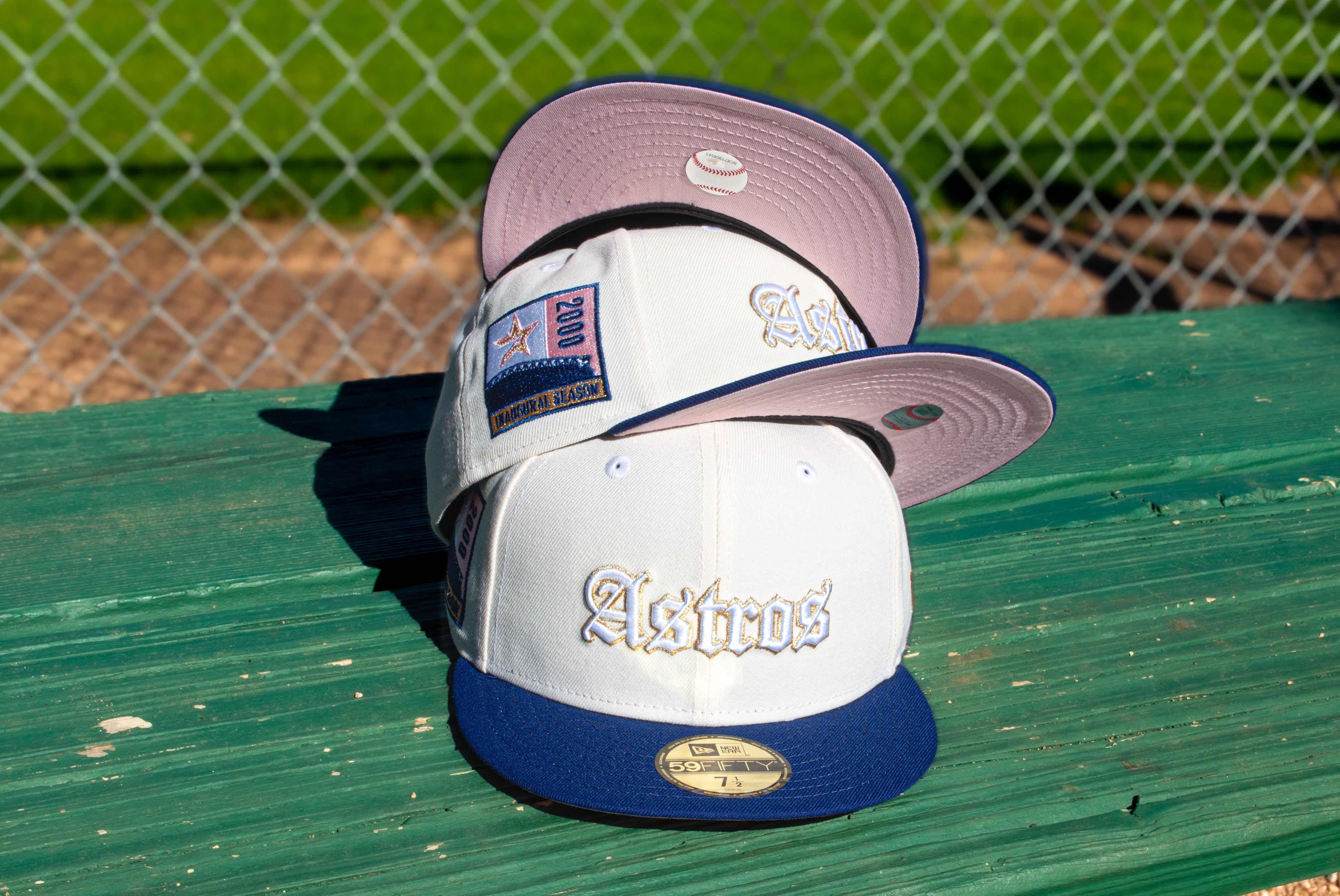 The Blueberry & Cream Astros fitted delivers a clean balance of classic and modern. Finished with chrome and metallic silver Astros script embroidery, subtle pink accents, and a light royal visor, this cap stands out while staying wearable.