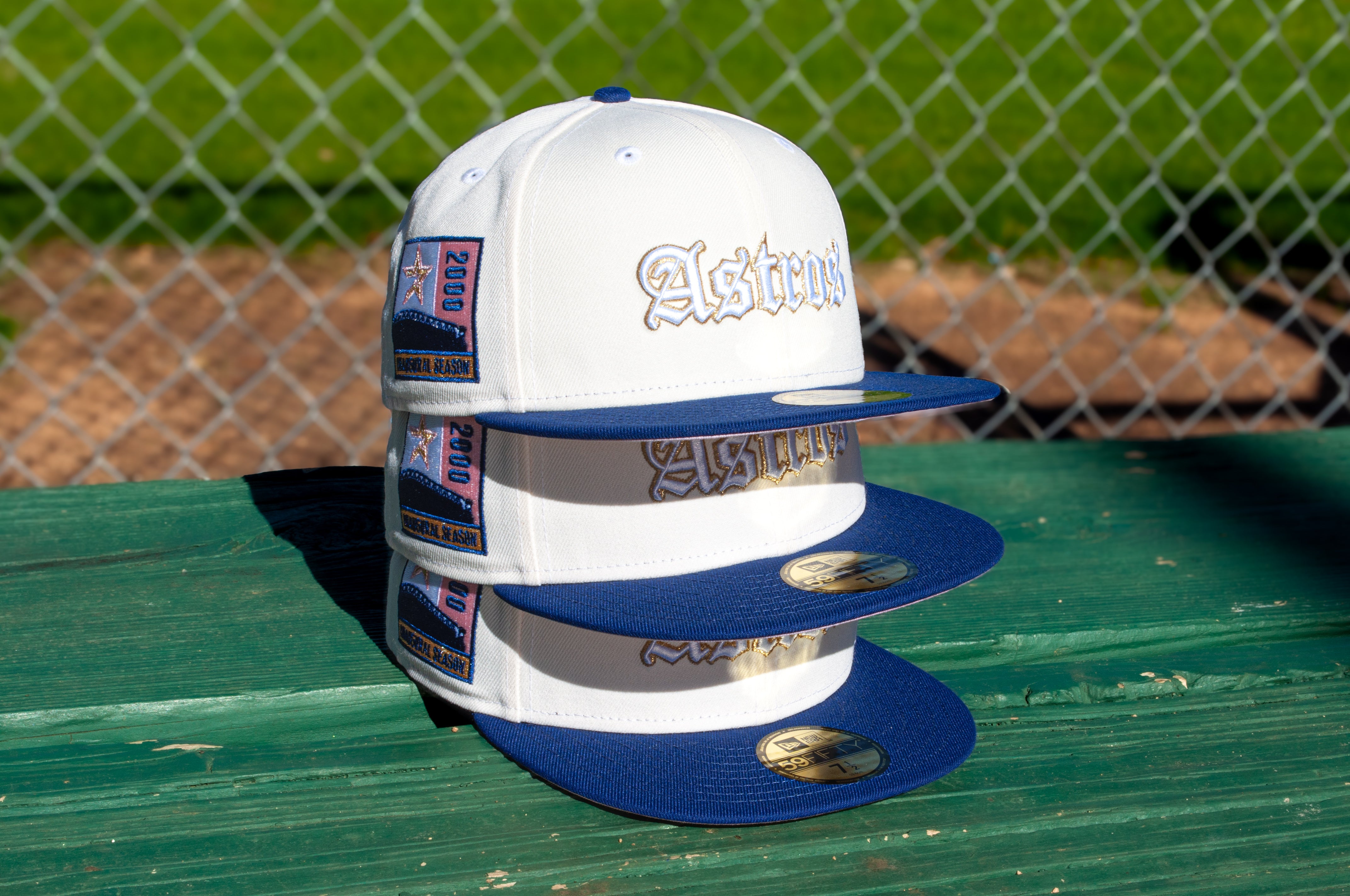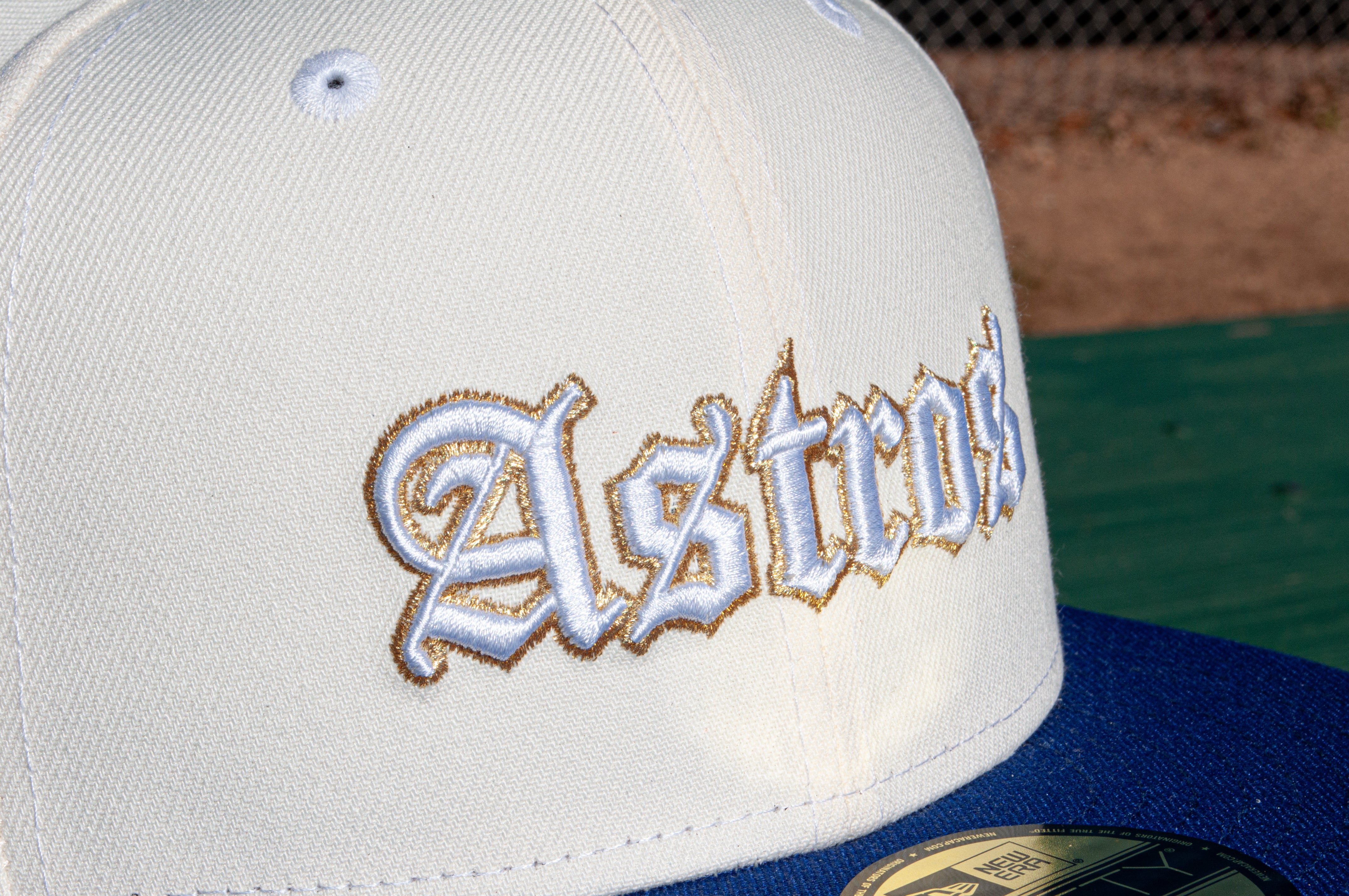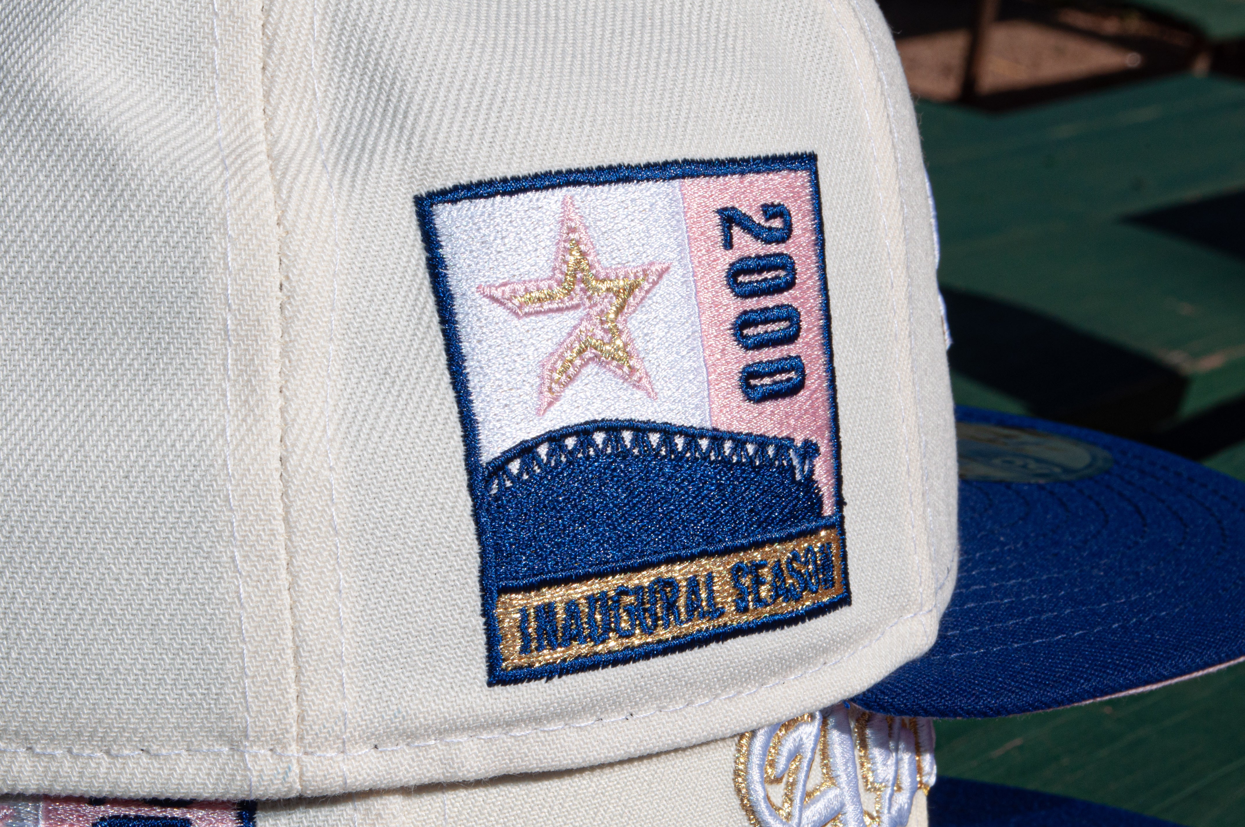 The Blueberry & Cream Astros fitted delivers a clean balance of classic and modern. Finished with chrome and metallic silver Astros script embroidery, subtle pink accents, and a light royal visor, this cap stands out while staying wearable.