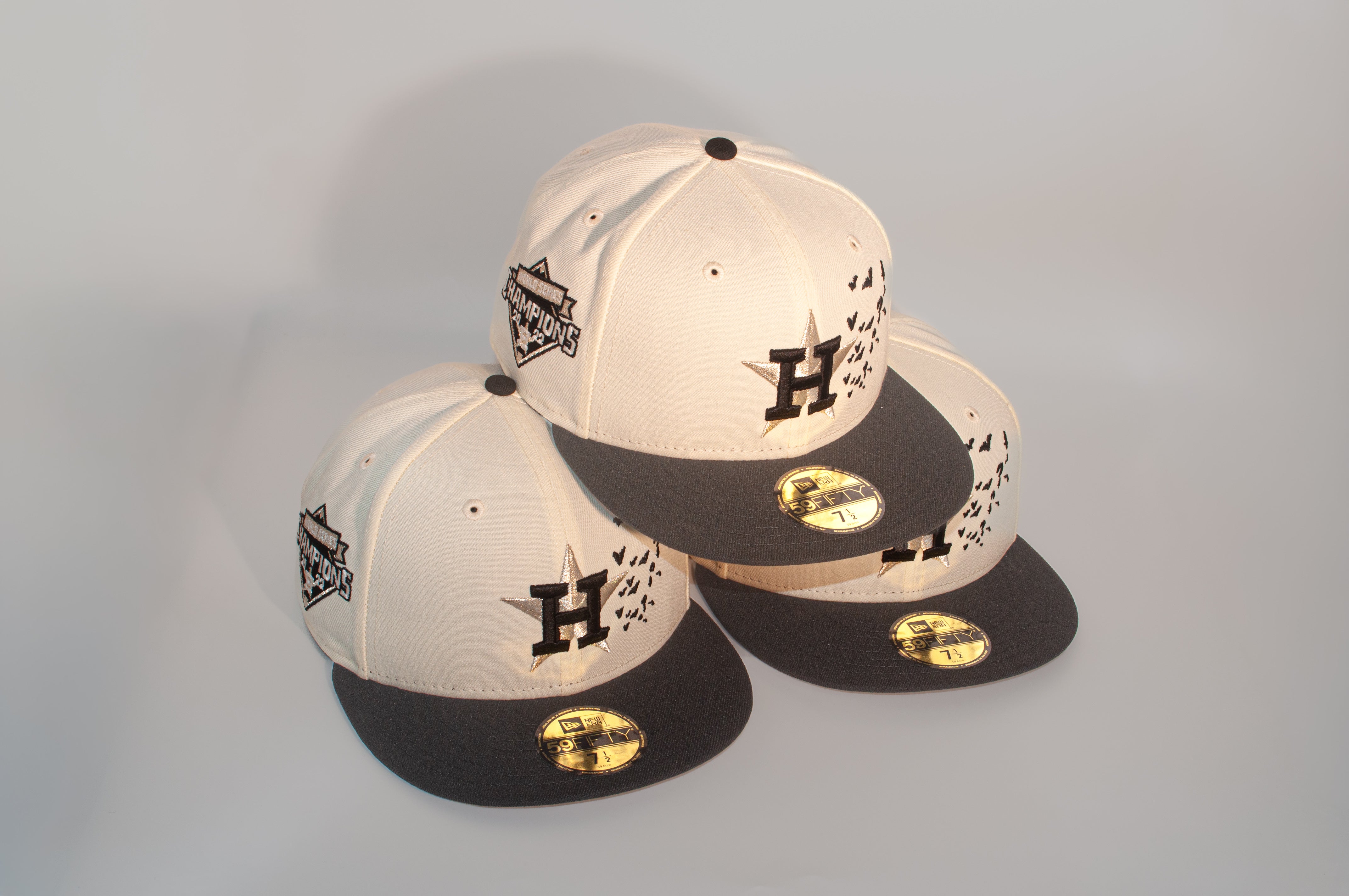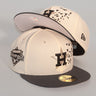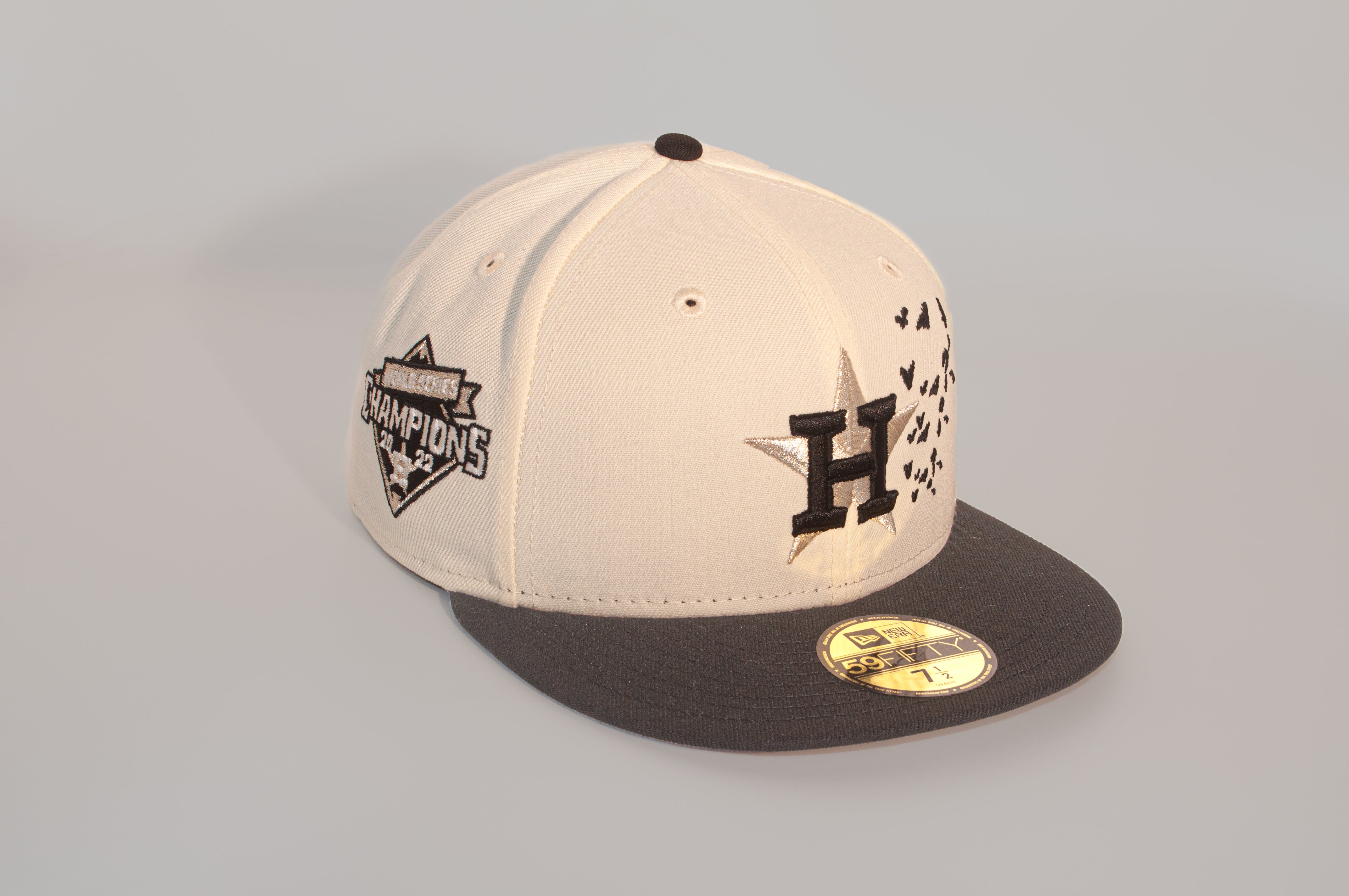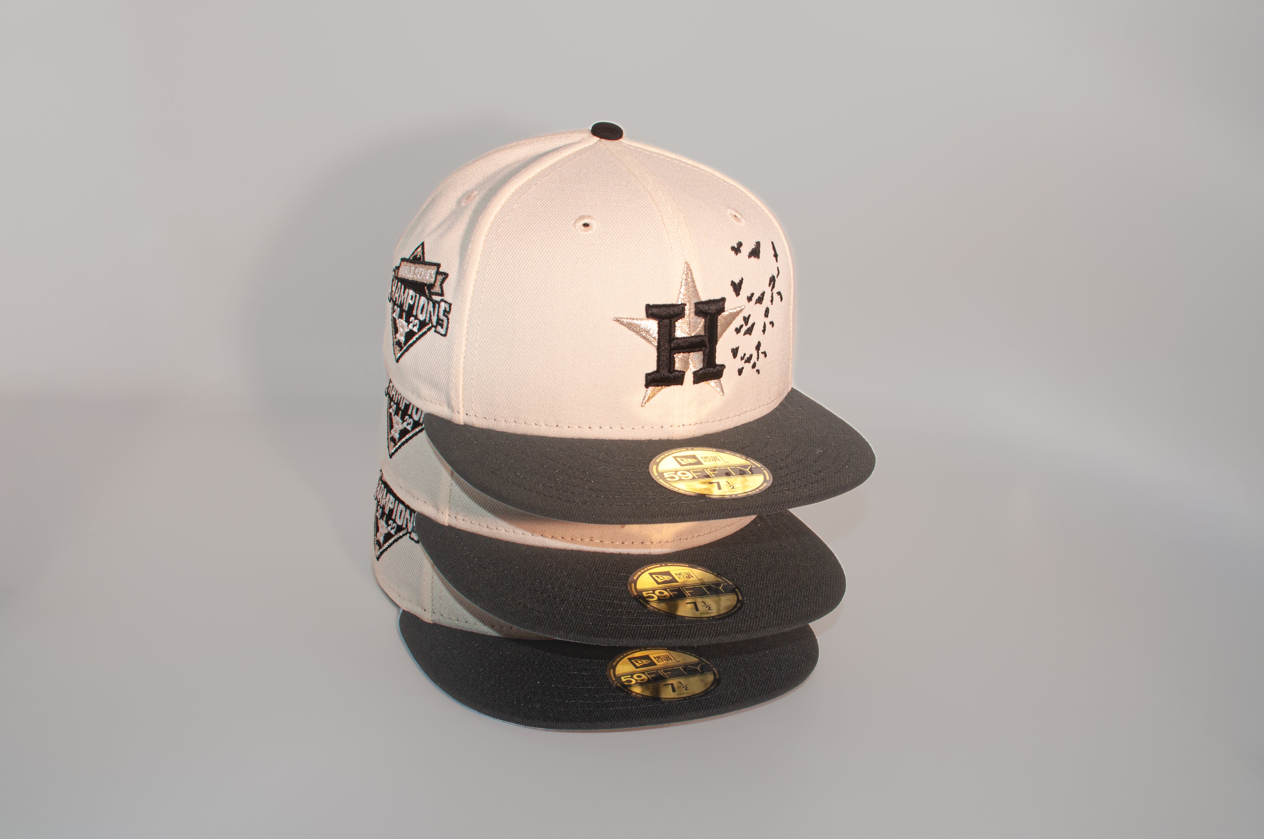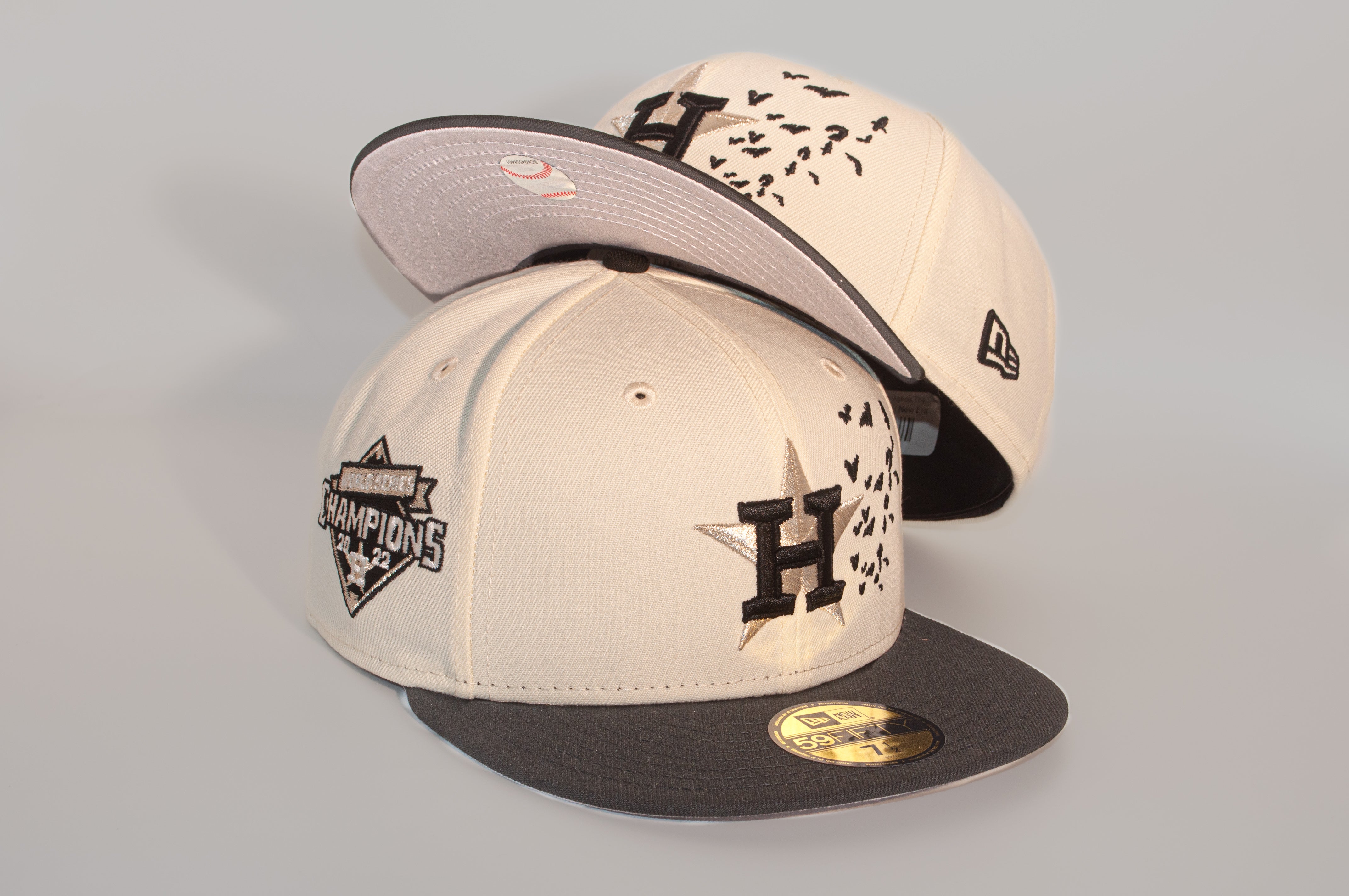 This fitted brings a hauntingly clean vibe to the Astros lineup. The crown comes in a soft chrome white paired with a jet-black visor and matching details throughout. The front logo features the Astros “H” in bold black embroidery outlined by a metallic silver star, surrounded by a flight of scattered bats — a nod to gothic design with a Houston twist.
