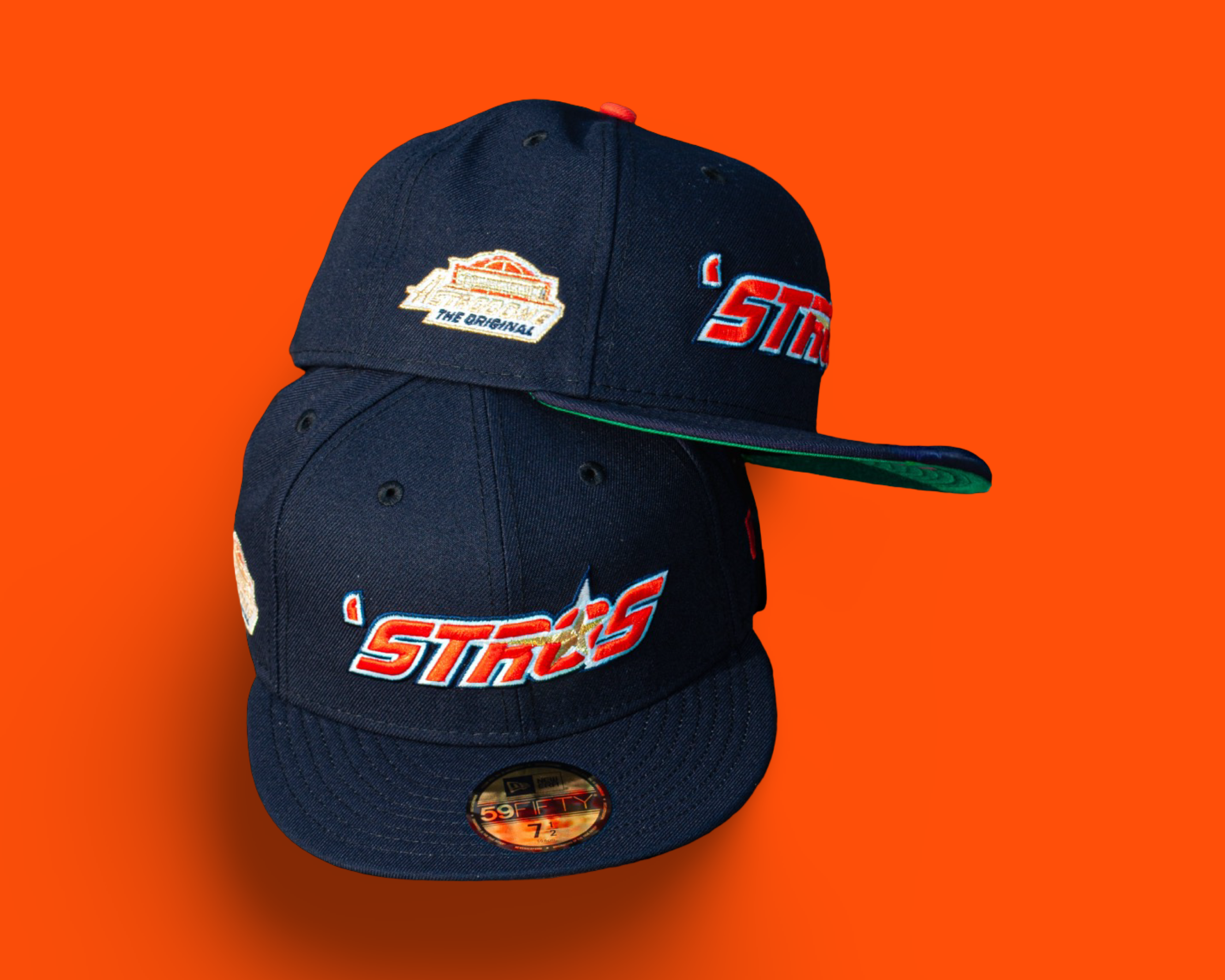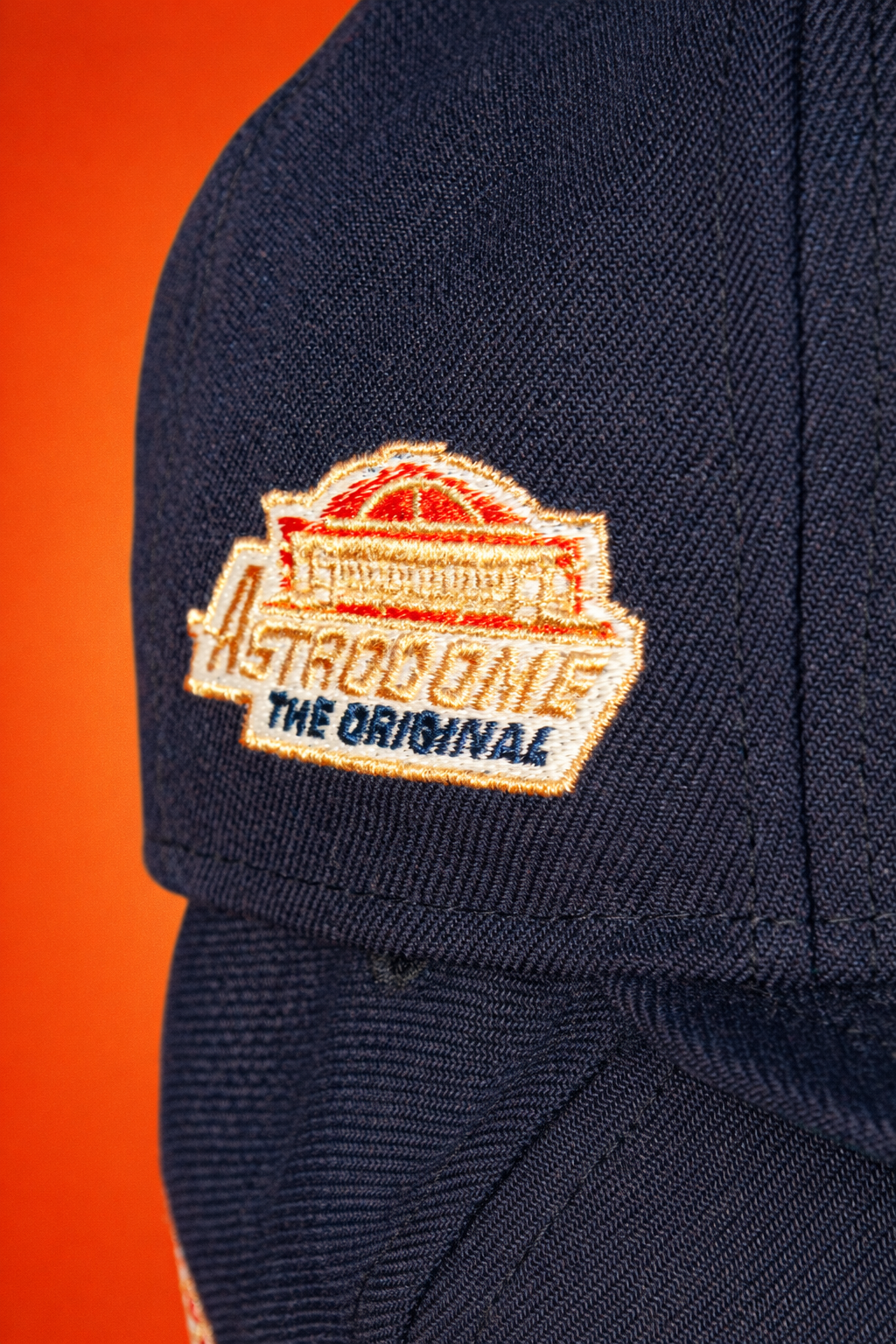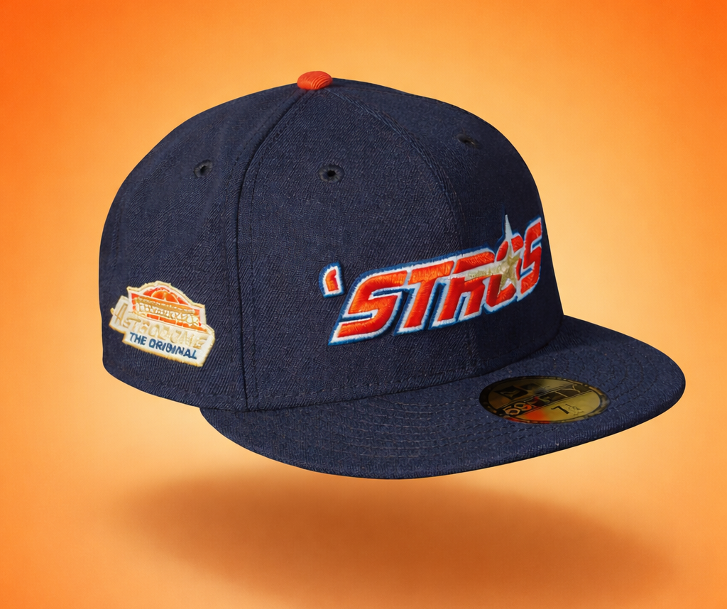 A bold nod to Houston heritage. This fitted features the iconic ’Stros logo embroidered on the front crown, paired with the Original Astrodome patch on the side for a true throwback finish. Crafted with a navy crown, accented by metallic gold, glow white, and orangeade embroidery, and finished with a Kelly green undervisor for that classic contrast. Built on a structured 5950 silhouette and fits true to size—a must-have for collectors who appreciate timeless details with modern execution.