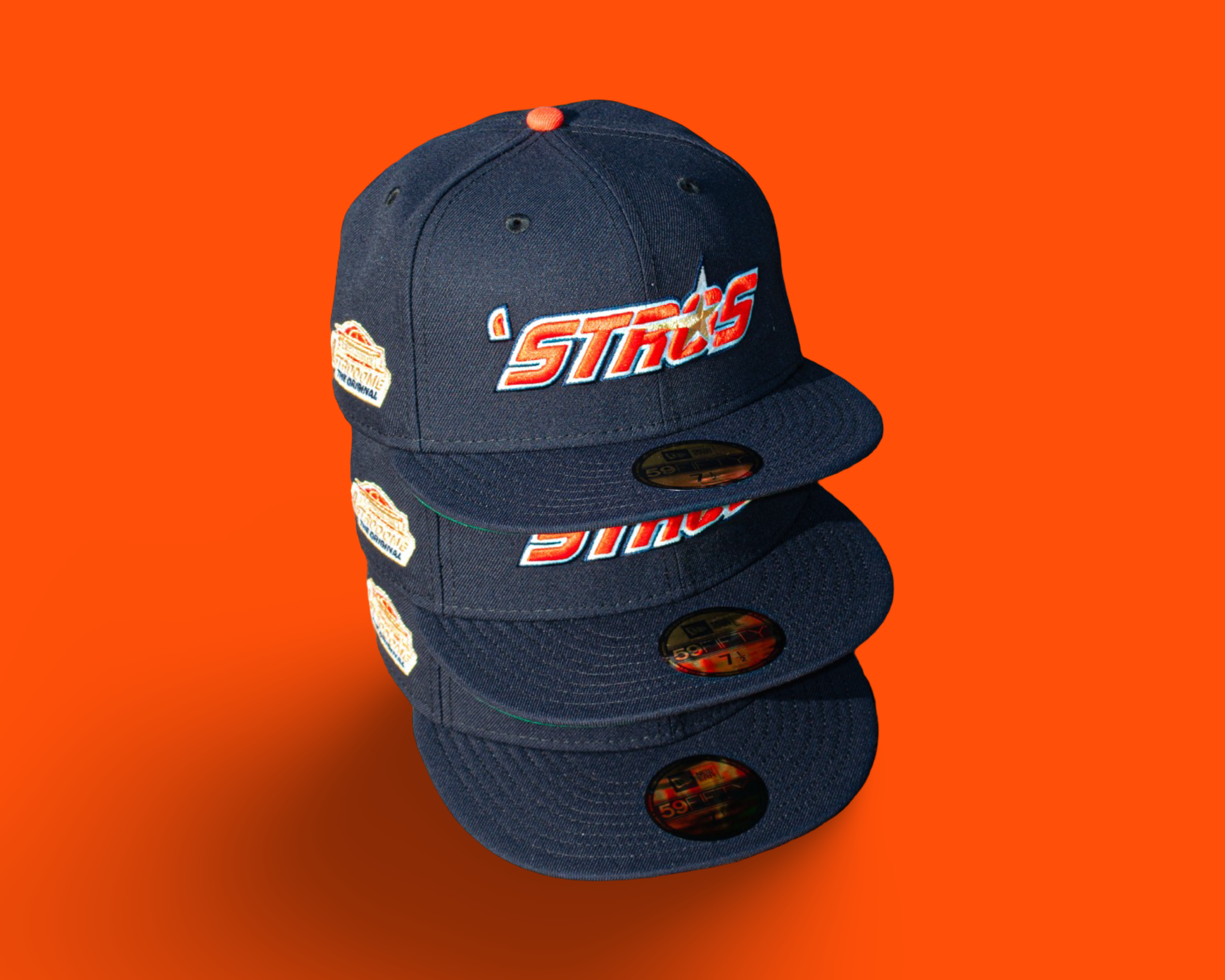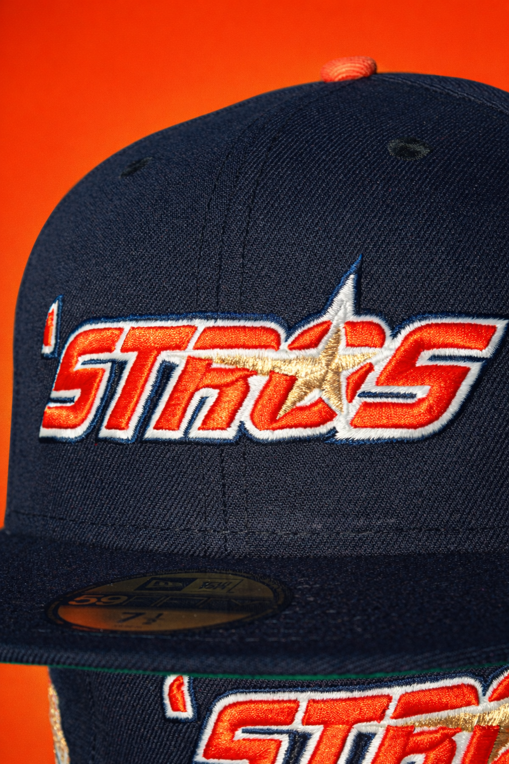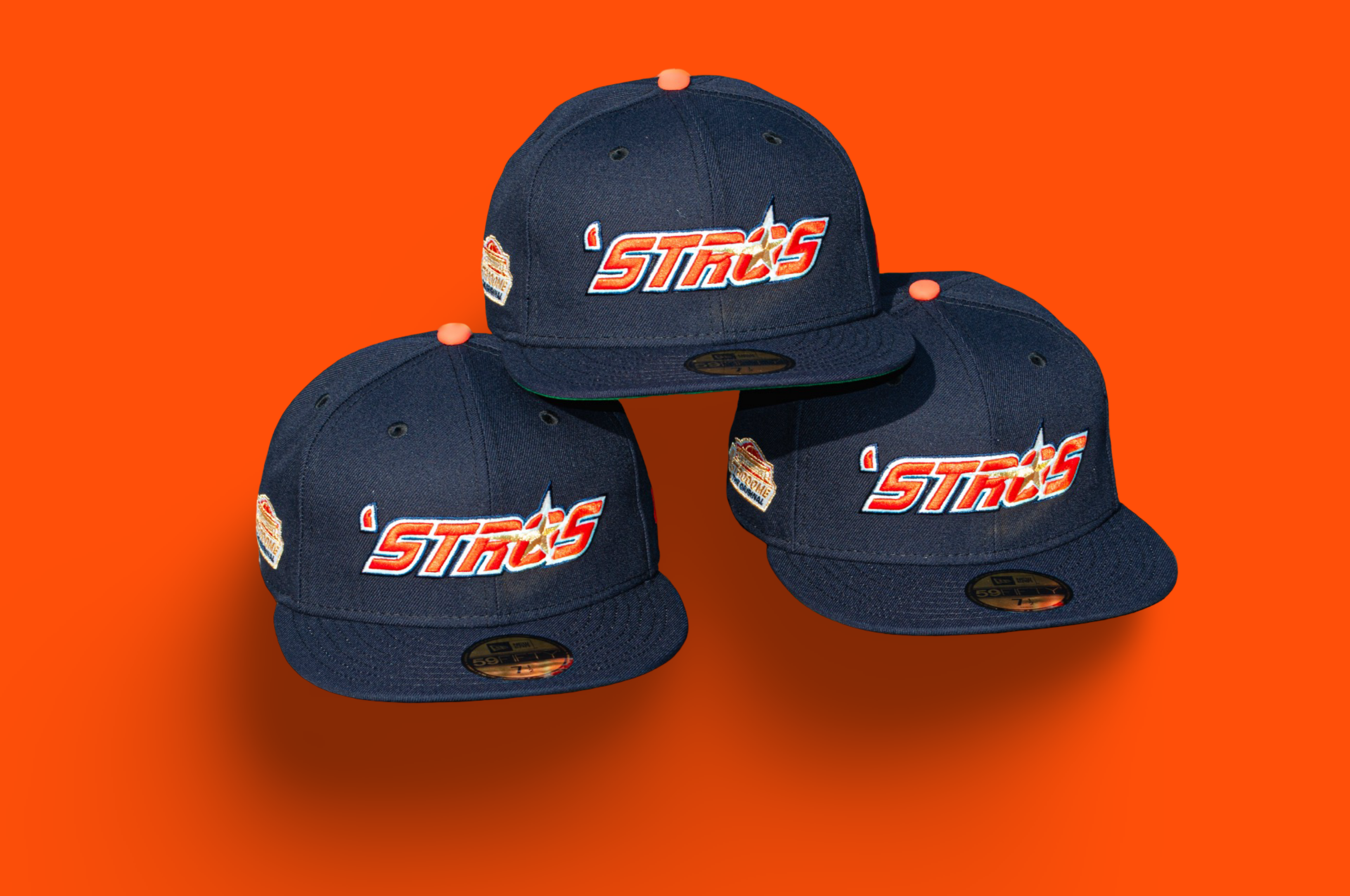A bold nod to Houston heritage. This fitted features the iconic ’Stros logo embroidered on the front crown, paired with the Original Astrodome patch on the side for a true throwback finish. Crafted with a navy crown, accented by metallic gold, glow white, and orangeade embroidery, and finished with a Kelly green undervisor for that classic contrast. Built on a structured 5950 silhouette and fits true to size—a must-have for collectors who appreciate timeless details with modern execution.