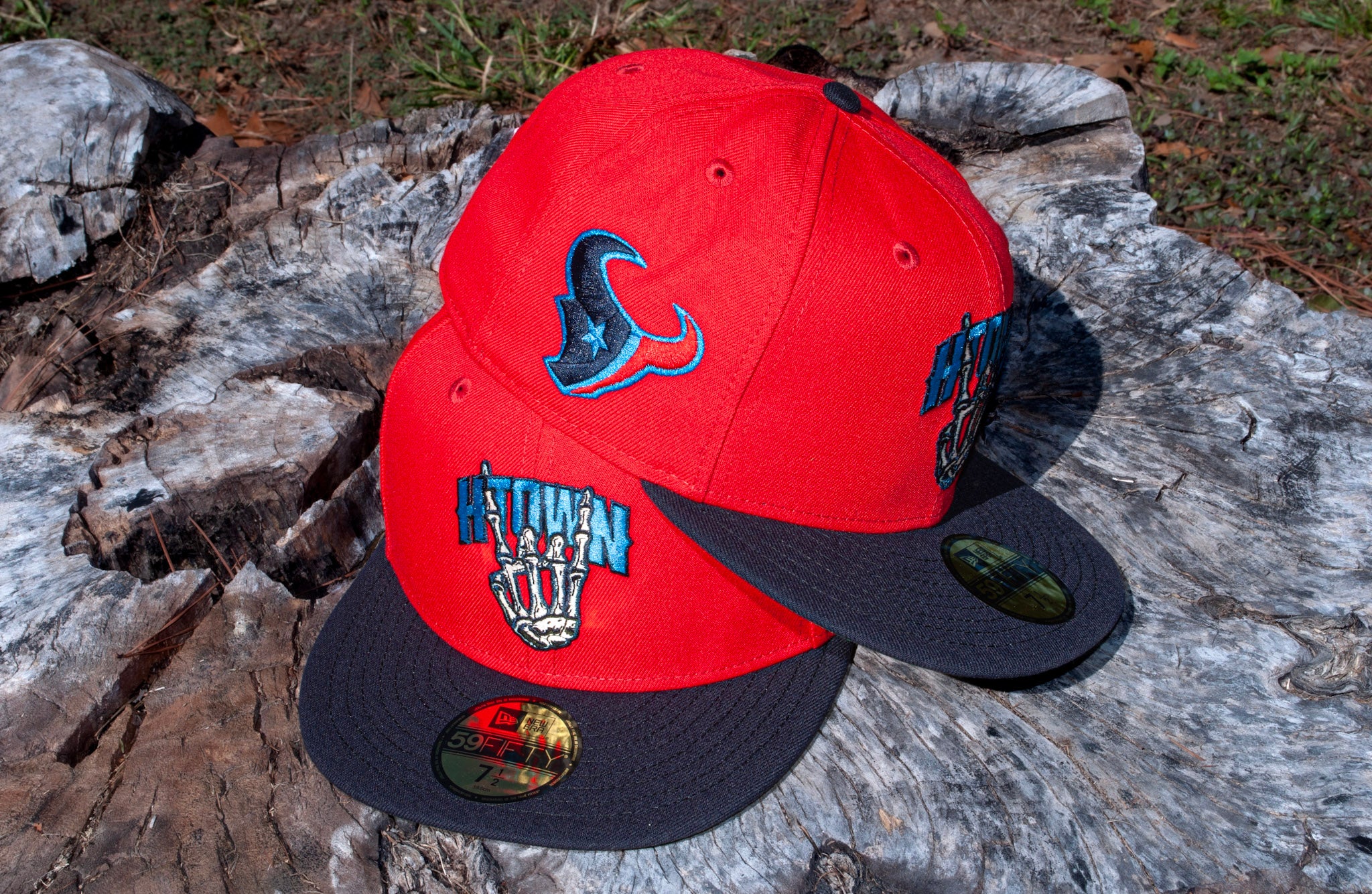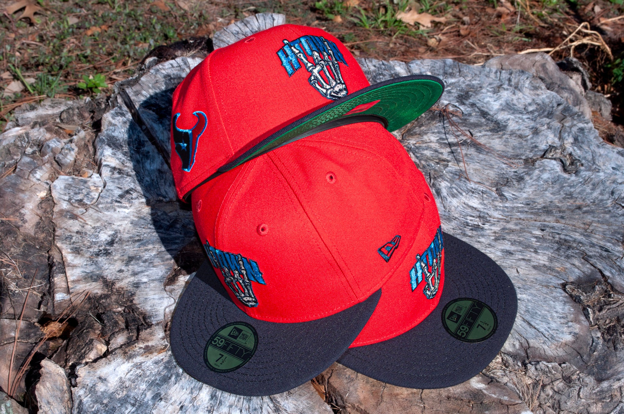 How about a Halloween surprise? Eight One x Sacred present, The Texans Bones Two Tone brings that gridiron grit—Battle Red crown, navy brim, vibrant blue pop, and a Kelly green UV that hits different in the light. A salute to the city that bleeds red and blue.