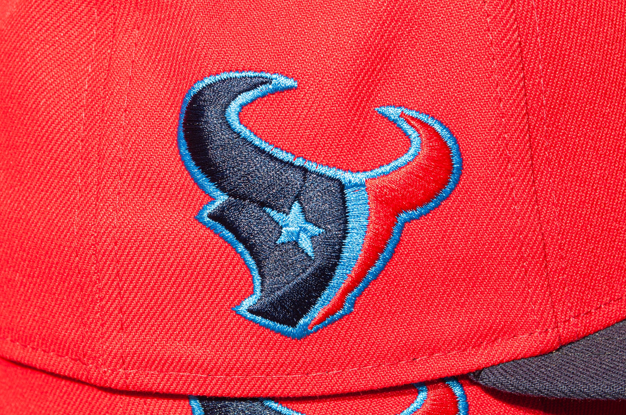 The bone hand throwing up the Houston “H”, adds attitude and bold presence to the cap. The hand hovers over a beautiful crisp blue, embroidered on a scarlet crown and finished off with a navy brim. The side patch is the always recognizable Texans bull logo.