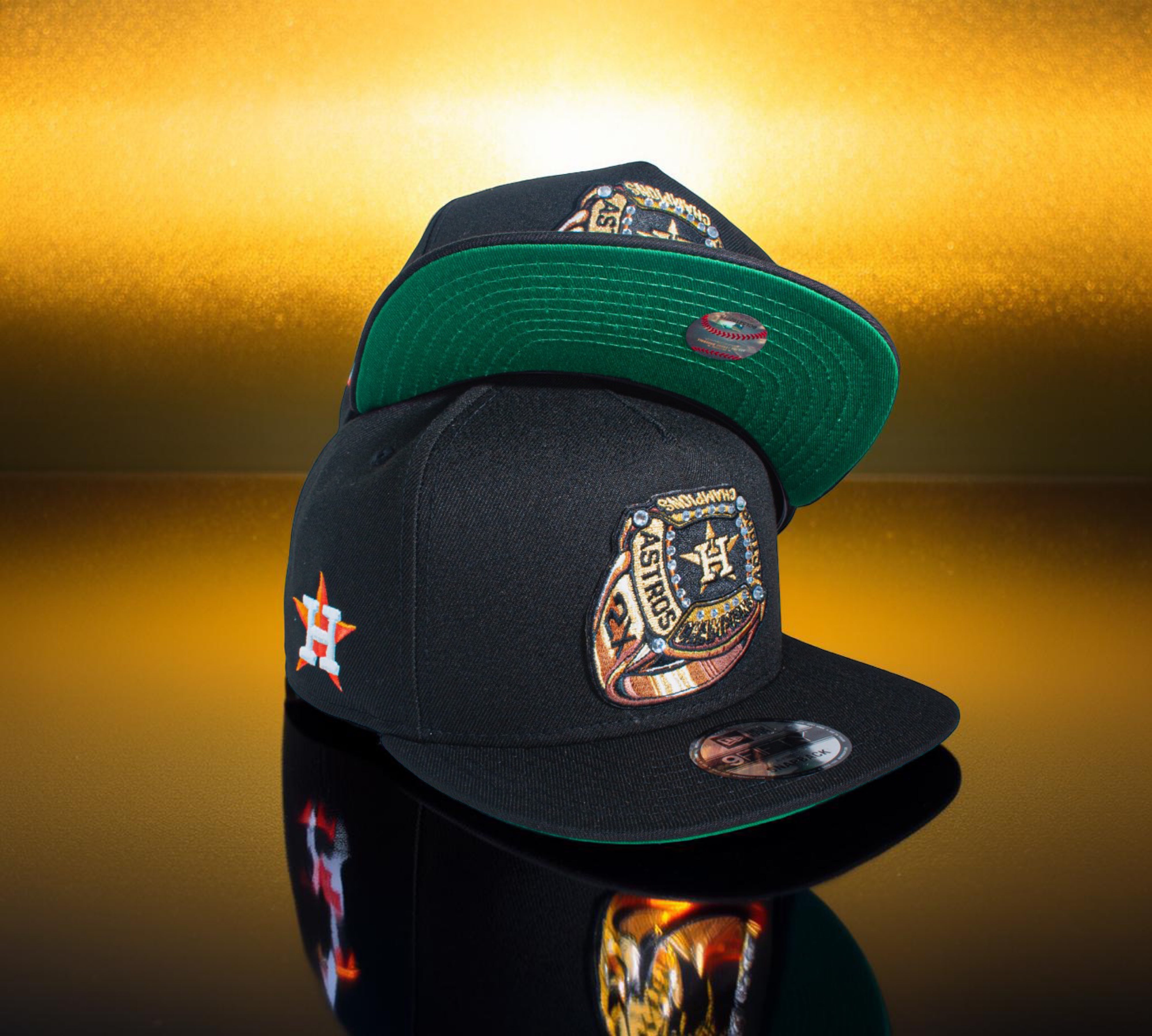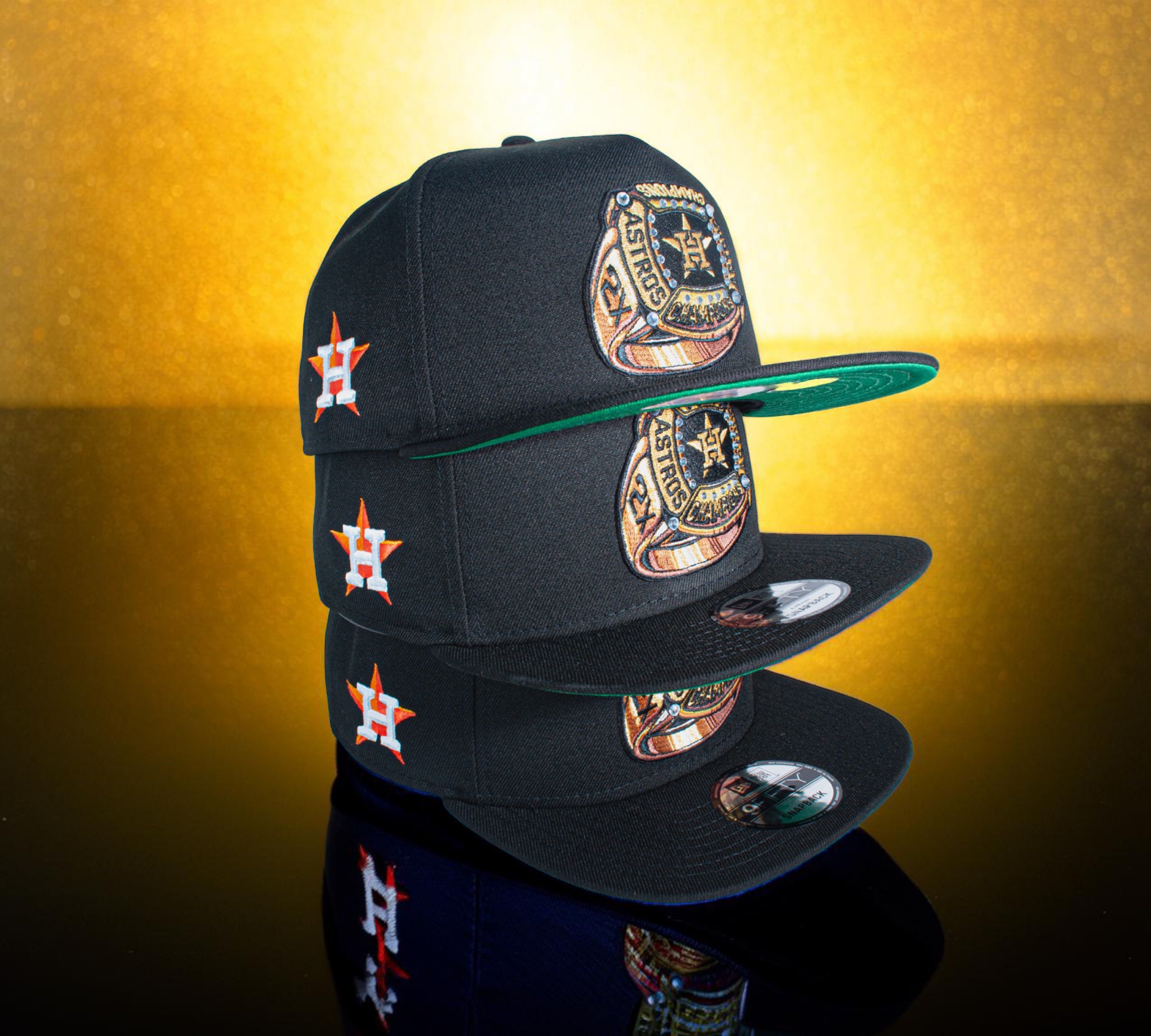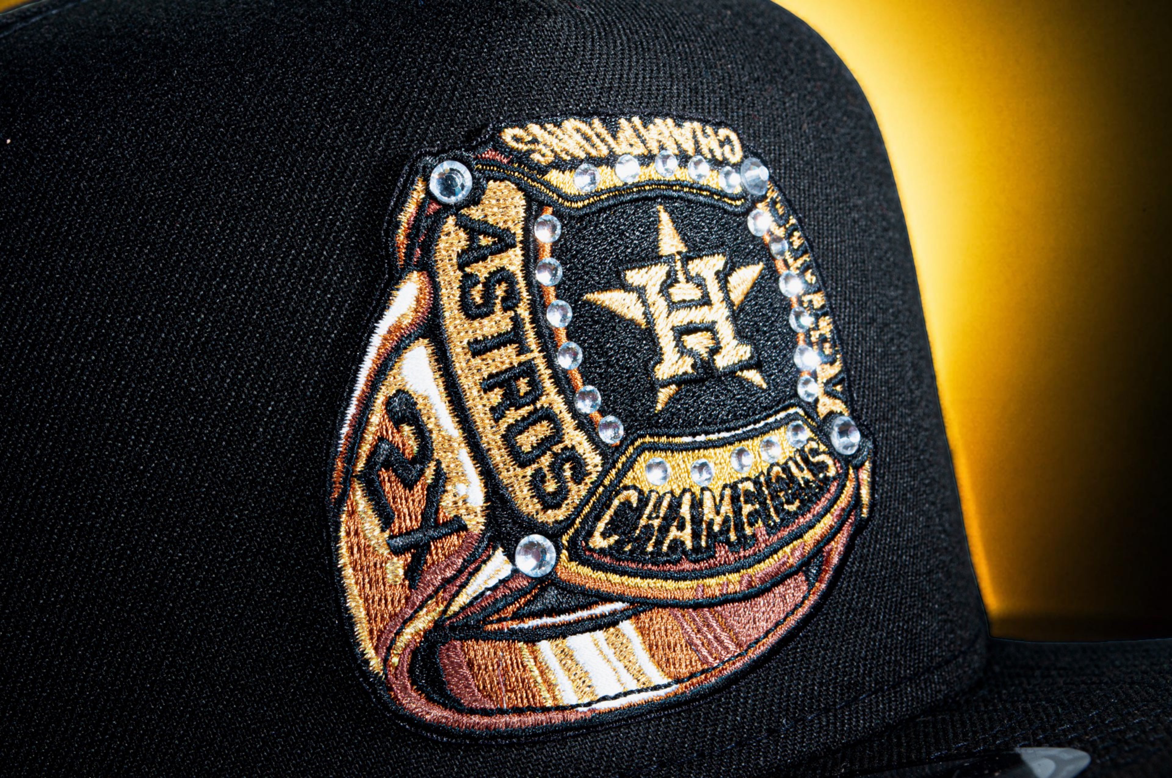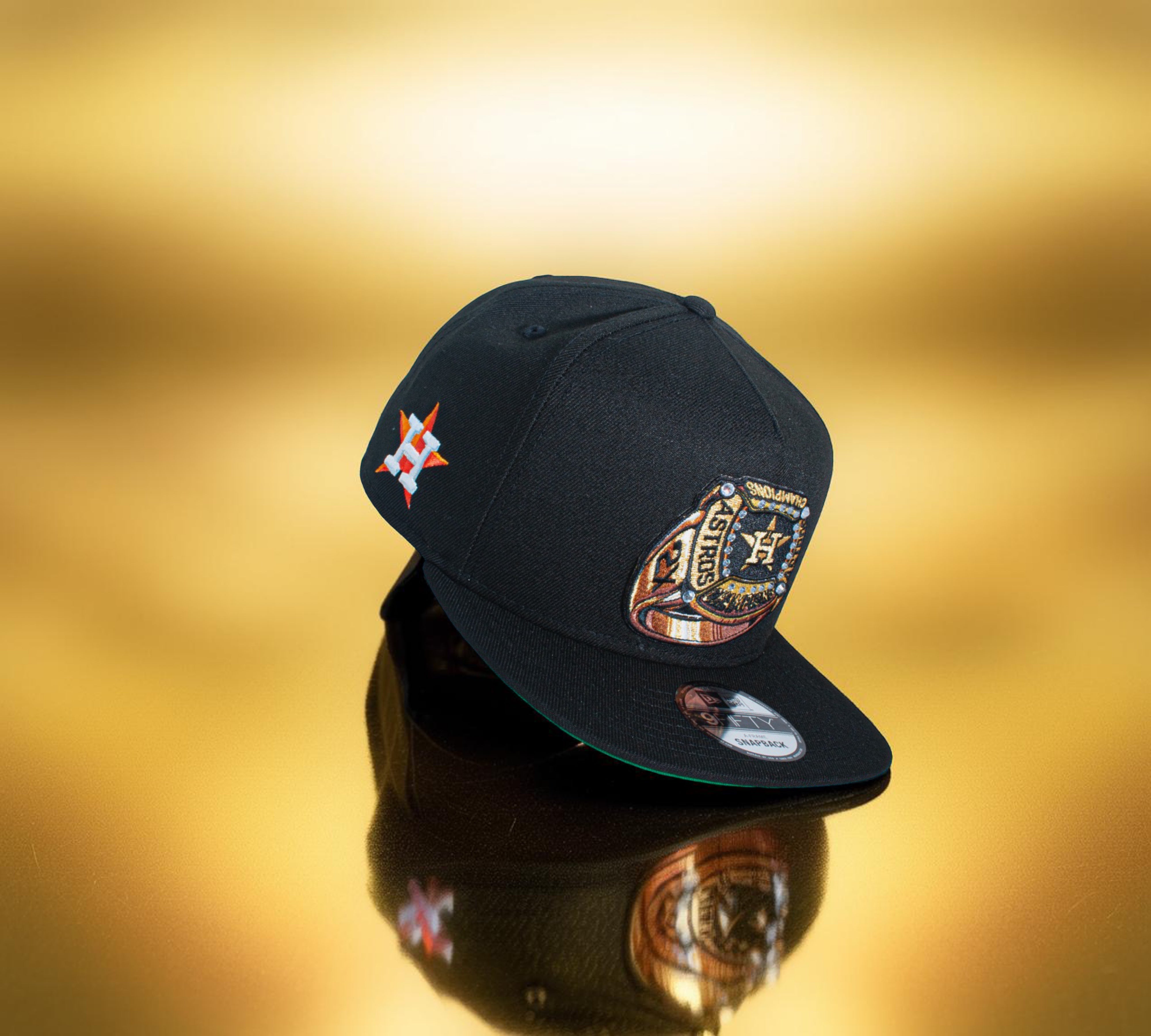 Celebrate championship energy in bold style with this Houston Astros New Era 9FIFTY Snapback. Featuring a detailed, ring-inspired embroidered front patch with metallic gold accents and stone detailing, this cap brings premium flair to a classic silhouette. The structured high crown and flat brim deliver that iconic 9FIFTY fit, while the snapback closure ensures an adjustable, comfortable wear.