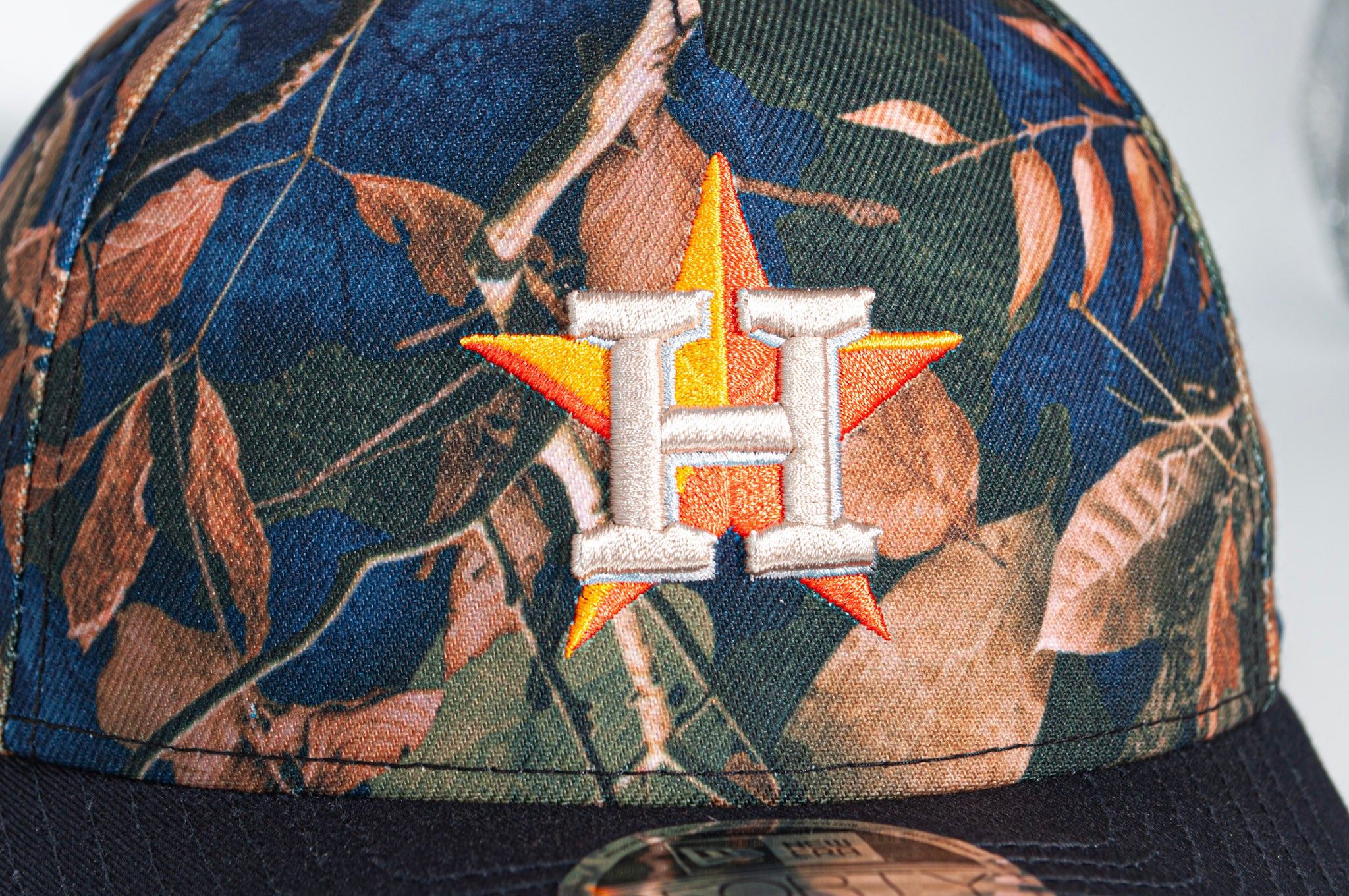 Rep the Astros in this colorful camo940 Snapback hat. The real tree camo has hints of blue all over, the current logo on the front and a snap closure on the back. The hat has a navy brim and a grey UV.
