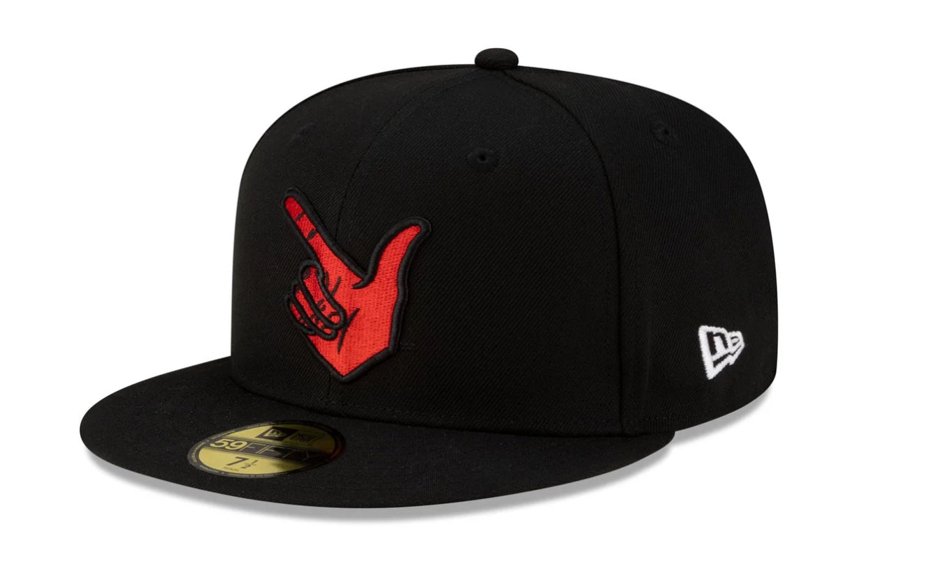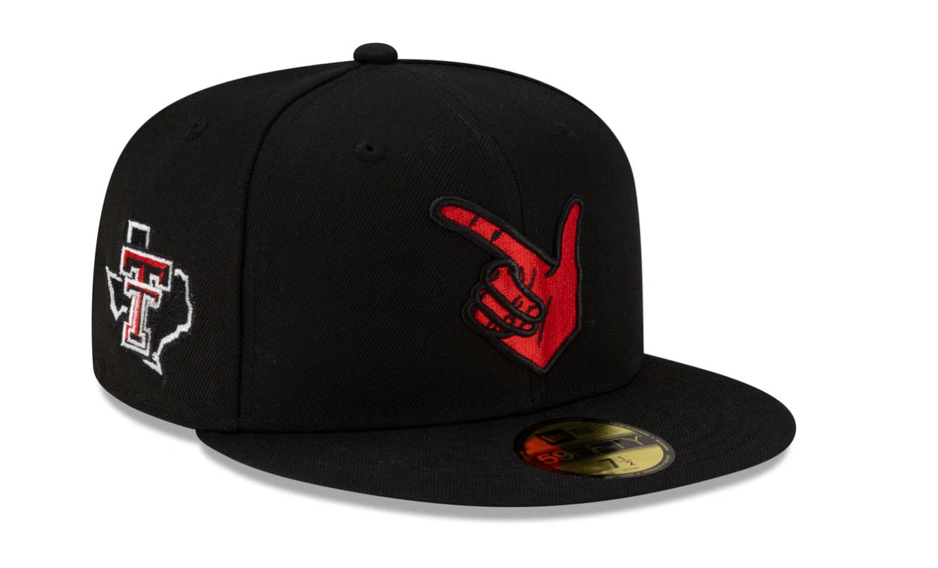 New Era Texas Tech Guns Up is a must have for all college sports fans and alumni alike. The hat has a black crown and brim and the Guns Up hand signal on the front in red. Texas Tech's logos are on the side and back. Grey UV.